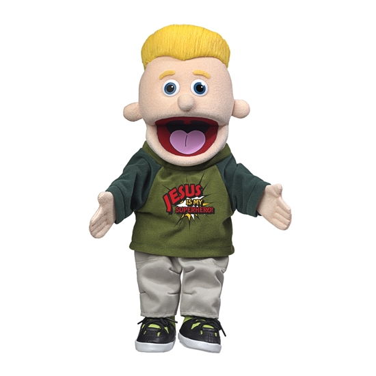 Charles is a hand puppet and he is wearing a shirt that says JESUS IS MY SUPERHERO!